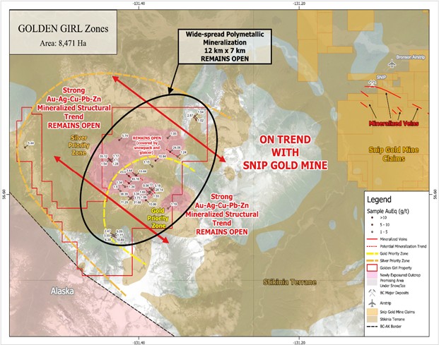 As described in the Company’s news release dated January 23, 2026, the Golden Girl property covers an area of 8,471 hectares (ha) in the Iskut River region of Northwestern British Columbia, just 17 kilometers from the Snip Mine and 14 kilometers from the Bronson Airstrip. Exploration conducted by B-ALL on the Golden Girl property identified a large new gold-silver system measuring 12 km by 7 km. The system features a gold-rich core surrounded by a silver-rich halo. Highlights from the 2024 exploration program include grab samples assaying up to 11.28 g/t Au, 3,262 g/t Ag, 5.37% Cu, 20% Pb, and 14.15% Zn, and channel cuts assaying up to 3.74 g/t Au, 2105.45 g/t Ag, 0.88% Cu, 5.48% Pb, and 7.42% Zn.
