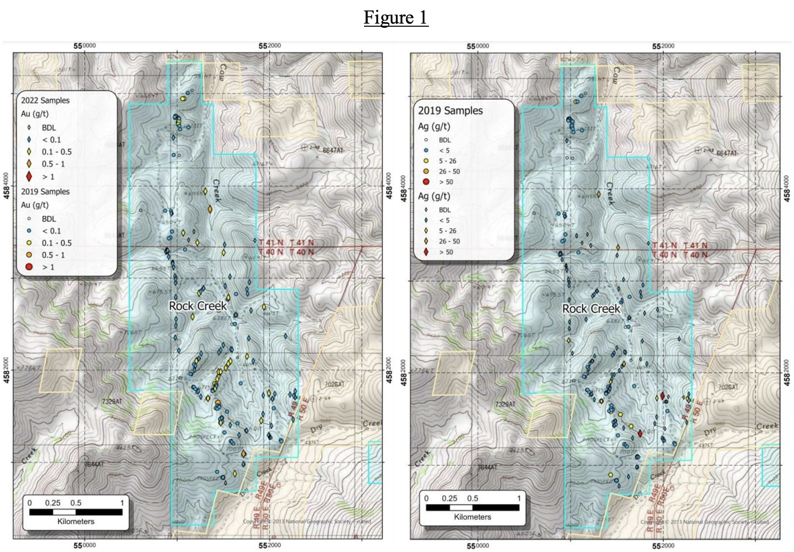 A previous press release (dated January 16, 2020) described results from the previous sampling programs undertaken at Rock Creek (included in Figure 1), which summarized the previously collected 98 surface samples and highlighted two gold values over 0.5 g/t (0.543 g/t and 0.597 g/t Au) and several samples in the 0.1 g/t to 0.35 g/t Au range.