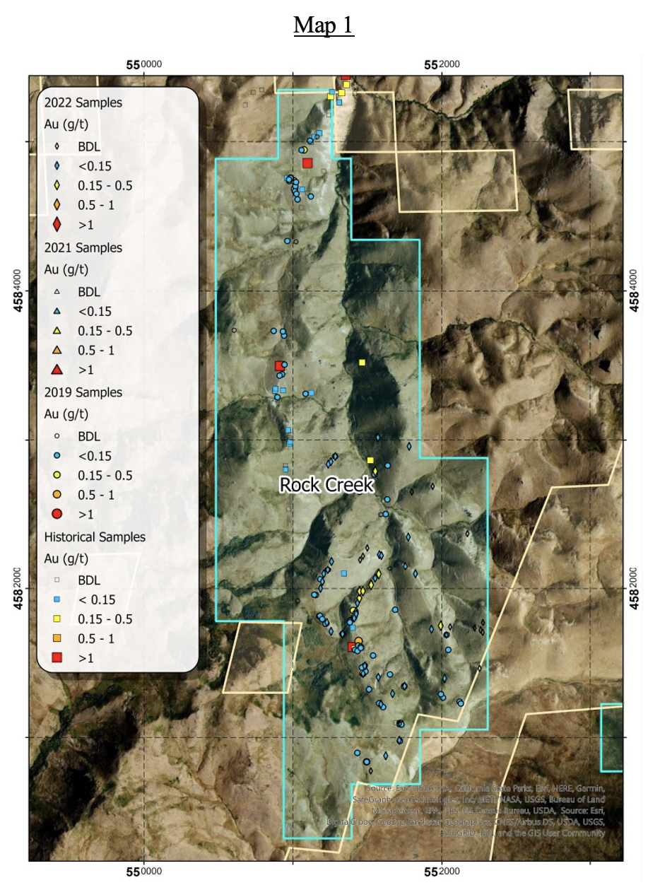 A previous press release (dated January 16, 2020) described results from the previous sampling programs undertaken at Rock Creek (included in Map 1), which summarized the previously collected 98 surface samples and highlighted two gold values over 0.5 g/t (0.543 g/t and 0.597 g/t Au) and several samples in the 0.1 g/t to 0.35 g/t Au range.