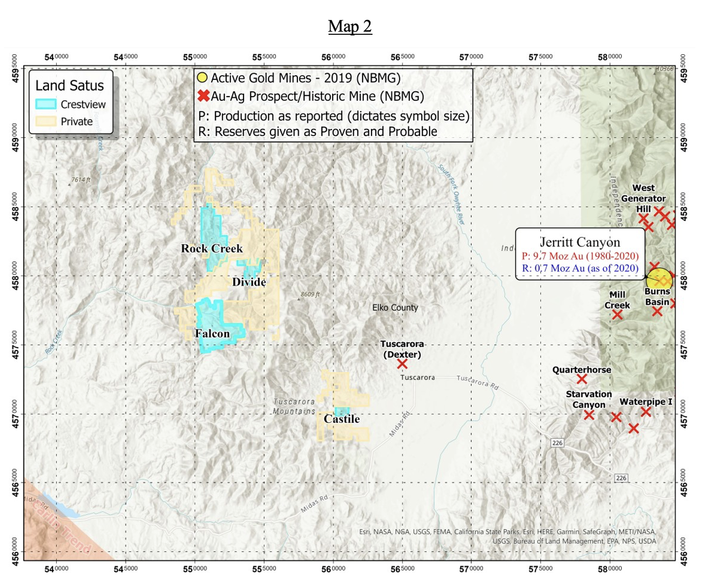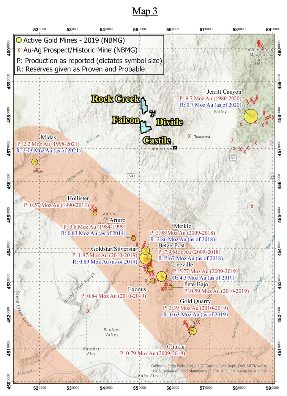 The Rock Creek gold project is Crestview’s flagship asset, with 74 unpatented lode mining claims wholly owned and controlled by CRS. The Rock Creek property was acquired in 2017, and the company went public in 2019. Emboldened by the results coming out of Rock Creek, Crestview has strategically expanded on the land position with the acquisition of the nearby Divide Mine prospect in April, 2020 and the recent acquisition of the Falcon Mine (September, 2022; see Map 2). Between the three deposits, all targeting similar mineralization and likely the same hydrothermal system, Crestview now holds 196 claims all within 2 kms of one another. These three gold projects (along with the nearby Castile project) are situated in a region with proven “world class” gold deposits (including Midas, Jerritt Canyon, Betze-Post, Meikle, and Gold Quarry), where the potential of finding large, high-grade gold deposits is favorable (see Map 3).