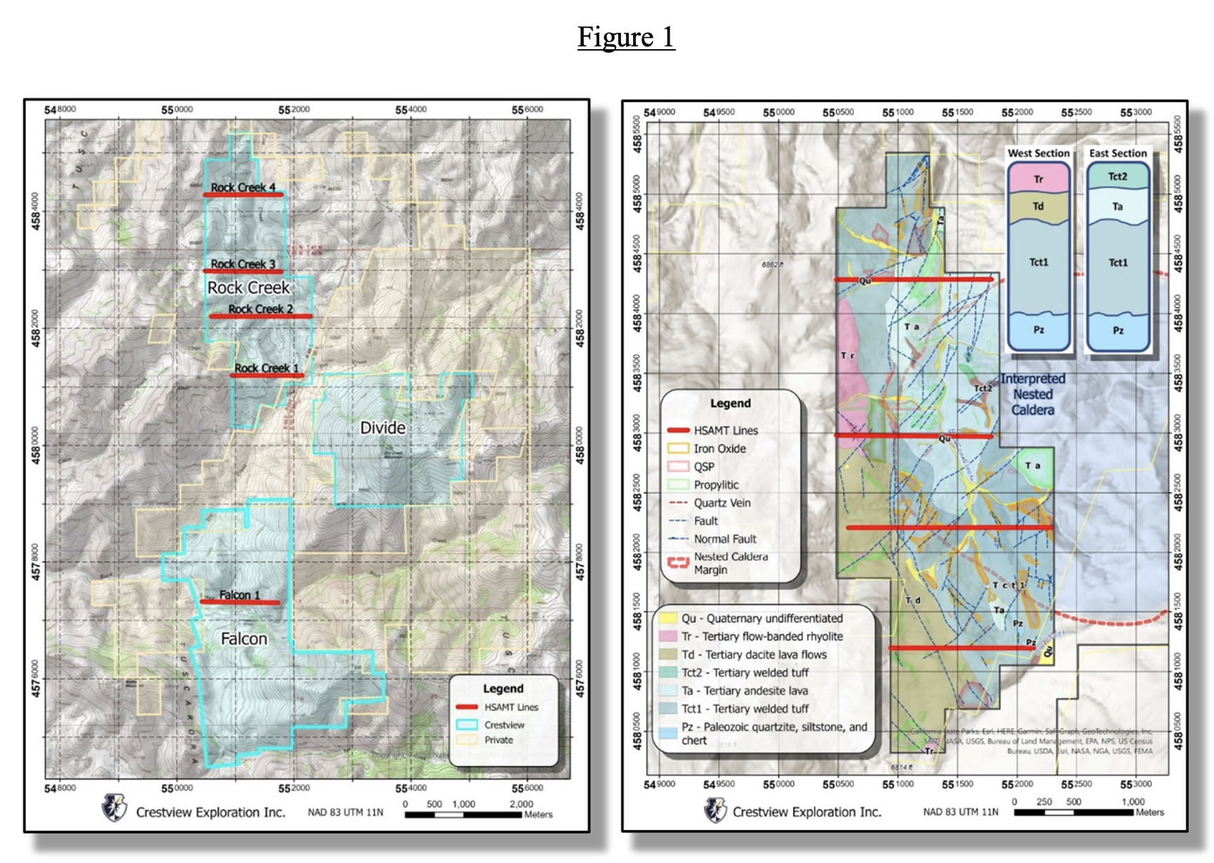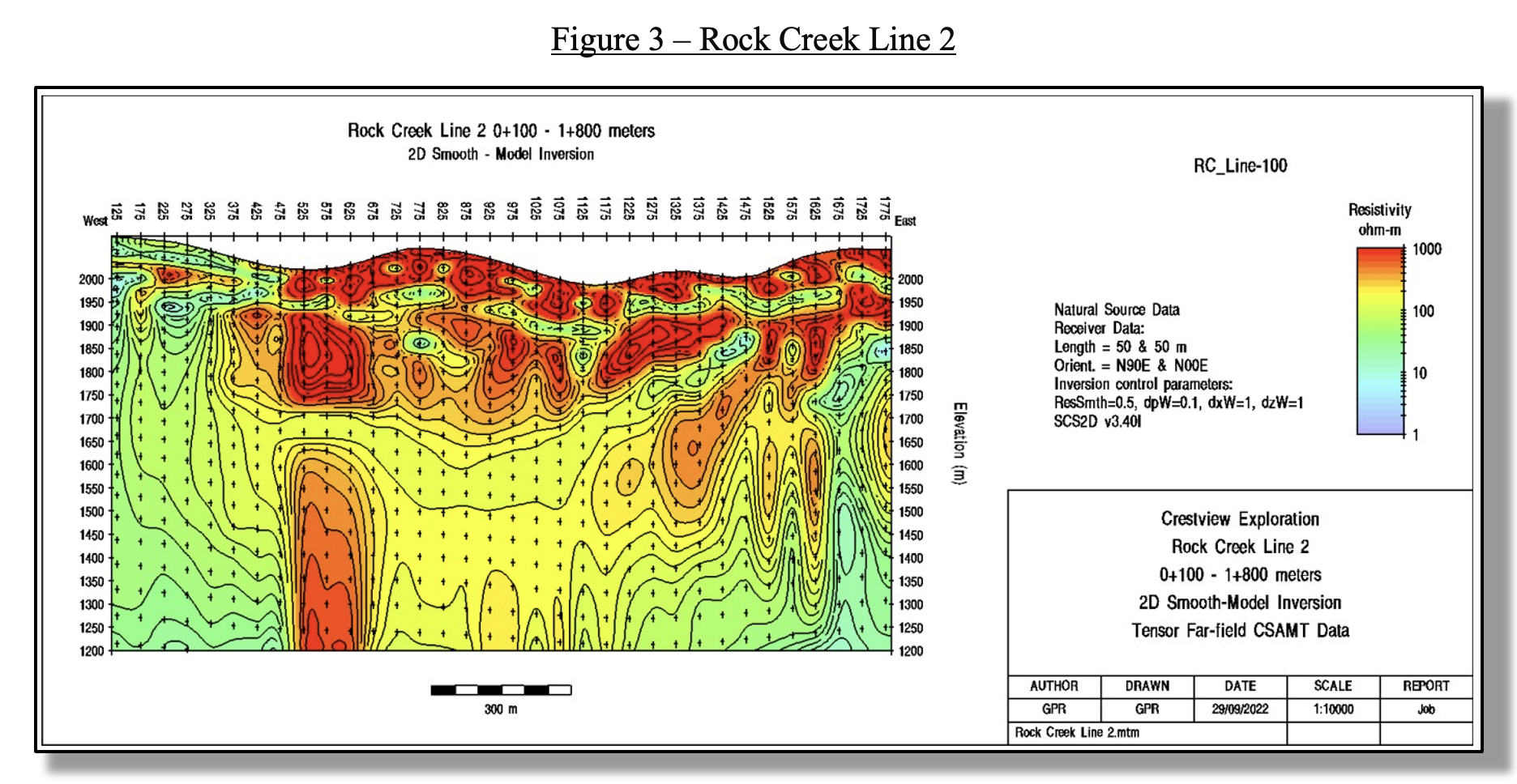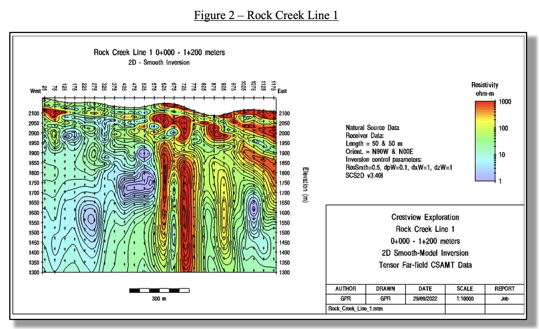 Crestview’s CEO, Chris Wensley, commented, “we are very encouraged and excited by what we are seeing in the HSAMT data and how it corresponds with our mapping efforts. Crestview has now accomplished all of the preliminary work set out ahead of drilling at Rock Creek, including mapping, sampling, and collecting geophysical and geochemical data. We are now in a position to pick the best possible drill targets at Rock Creek, and we are eager to test the targets in 2023.”