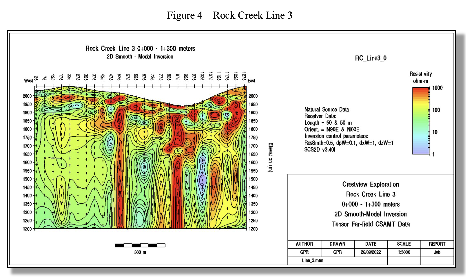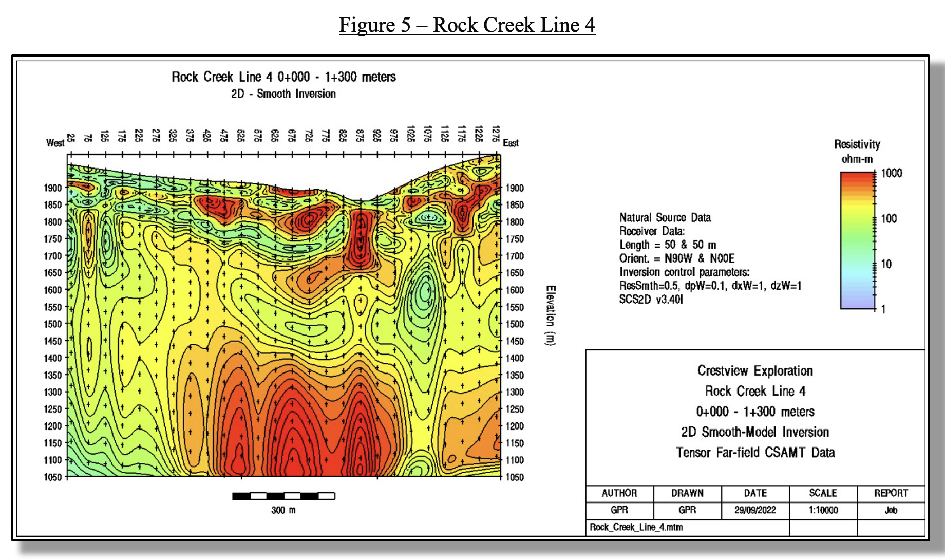 Crestview is in the process of integrating this data with the other results taken to date, including the 2022 high-resolution mapping at Rock Creek. The surface lithologies and interpreted stratigraphic sections are being utilized to interpret possible lithology/Formation changes. Additionally, the vertical/sub-vertical structures (which reach the surface) in the HSAMT sections correspond well with the mapped faults.