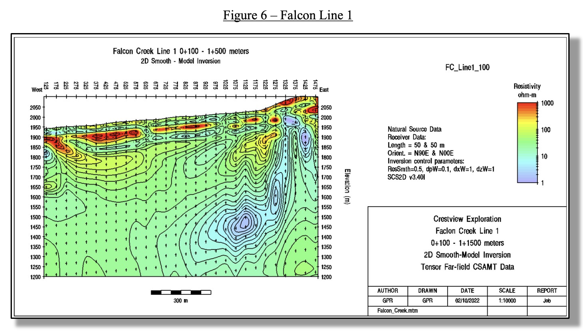 The section at Falcon corresponds well with the nearest CSAMT section Crestview inherited with the Falcon data (Ironwood Gold Corp.: Preliminary Assessment of Falcon Mine Property, 2012). In the inherited report, the low-resistivity signal at depth (below approximately the 1,800 meter mark) is interpreted to indicate “extremely conductive altered carbonaceous lower plate sediments” (Ironwood Gold Corp.: Preliminary Assessment of Falcon Mine Property, 2012).