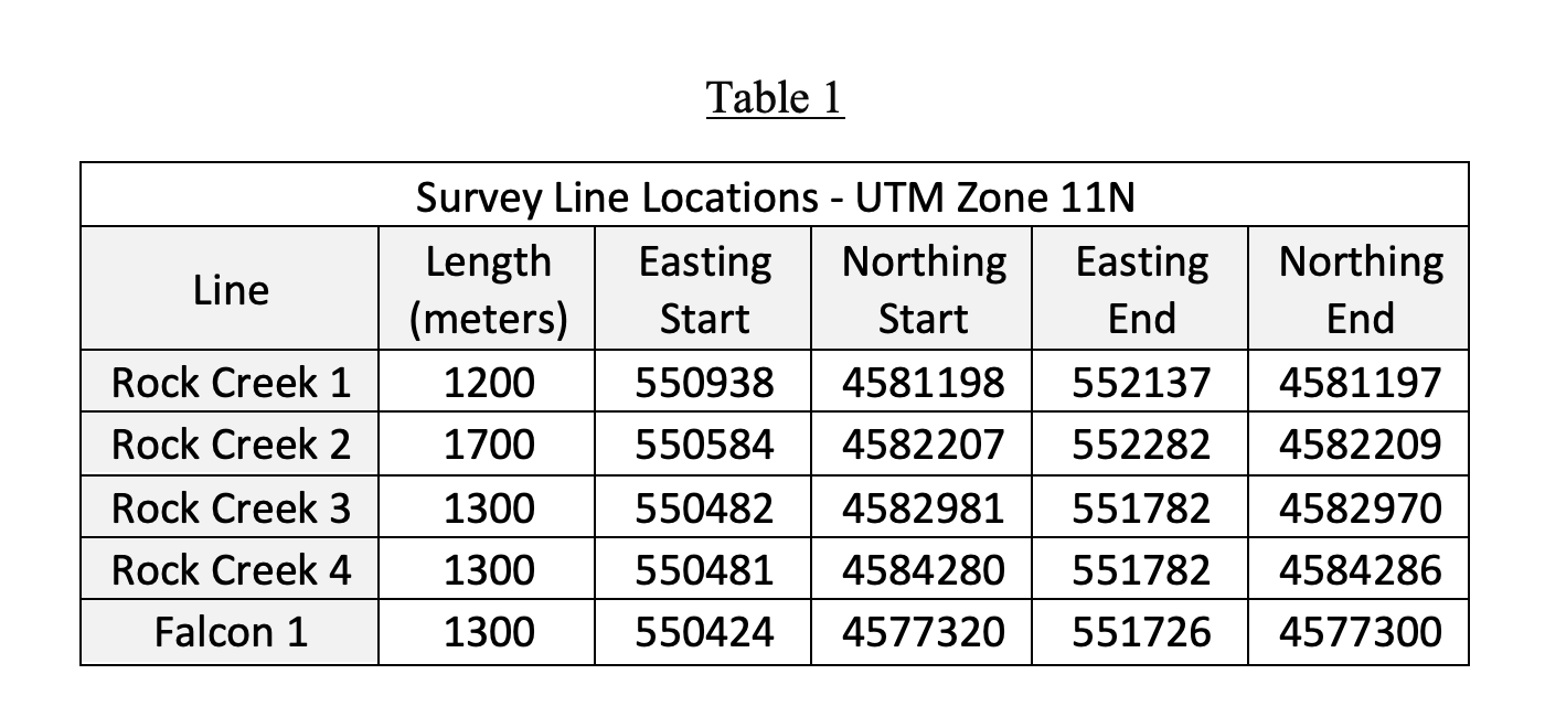 The lines were oriented E-W to cross the dominant structural fabric in the area. Please refer to Figure 1 for approximate locations and corresponding surface geology at Rock Creek. The four lines at Rock Creek were widely spaced across the length of the property, and the Falcon line was chosen to offset the inherited Falcon CSAMT data in the area of the historic mine.