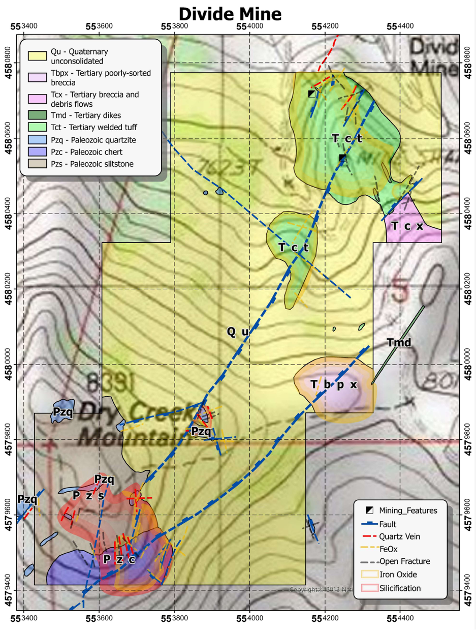 The geology of the Divide property includes Palaeozoic siliciclastic rocks and Tertiary volcanic rocks (Map 1) variably altered and mineralized along structures. The Tertiary volcanic package is exposed in the NE portion of the property, in the area of the historic Divide Mine. The Tertiary package can be divided into three groups: 1) intracaldera lithic-rich, rhyolitic ash-flow (Tct) which hosts mineralization; 2) poorly sorted megabreccia (Tbx); and 3) small post-mineralization dacite dikes (Tdd). The Palaeozoic package, exposed in the SW portion of the property, consists of siltstone (Pzs), bedded chert and orthoquartzite (Pzq).