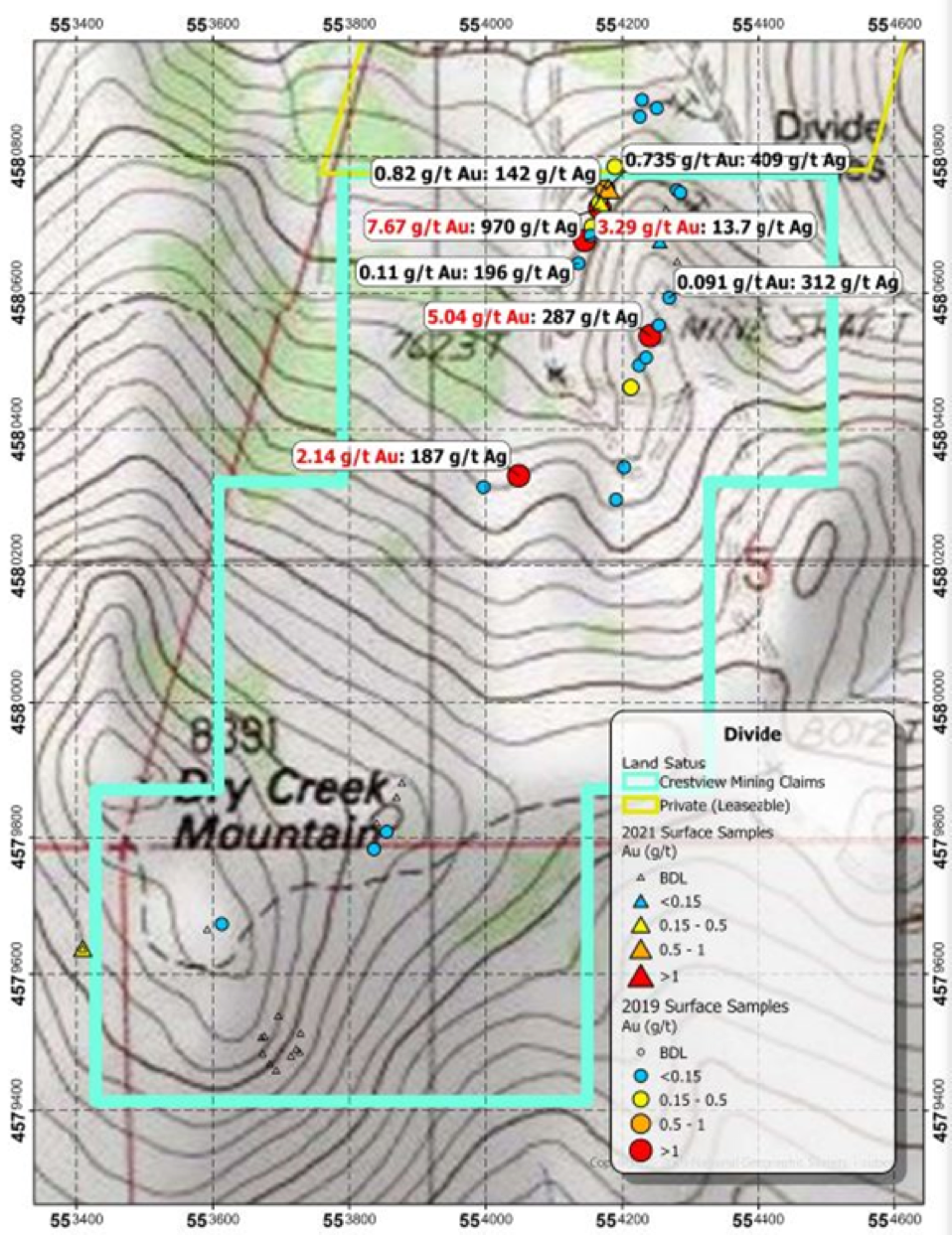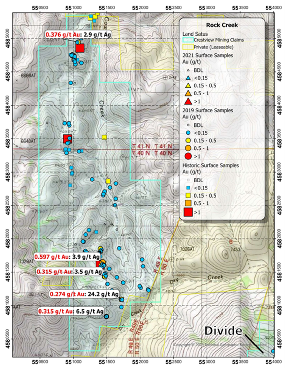 Chris Wensley, CEO commented that “the observations made during our Tuscarora mapping and sampling have provided several new avenues for future targeting, including possible claim expansion at Rock Creek and Divide. Crestview is also planning to conduct a depth-penetrating geophysical survey over the Rock Creek and Divide target areas in late Spring/early Summer, 2022 ahead of our planned Reverse Circulation drilling program.