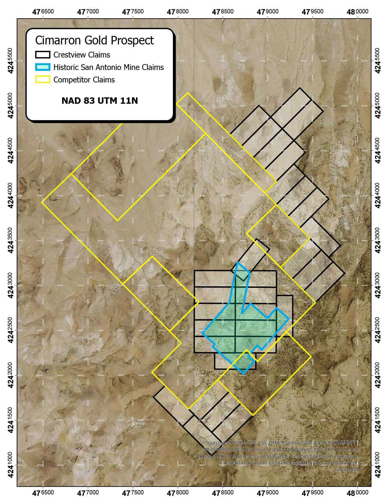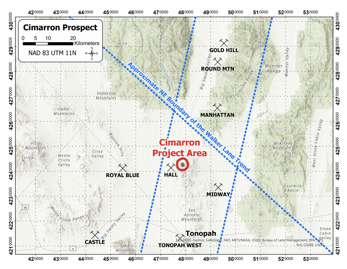 The Cimarron project is located in the San Antonio Mountains of Nye County, Nevada, and is comprised of 31 unpatented lode mining claims, including control of 6 historically producing claims associated with the historic San Antonio mine. The property is located in the prolific Walker-Lane trend, approximately 44 kms south of the “world class” Round Mountain deposit.