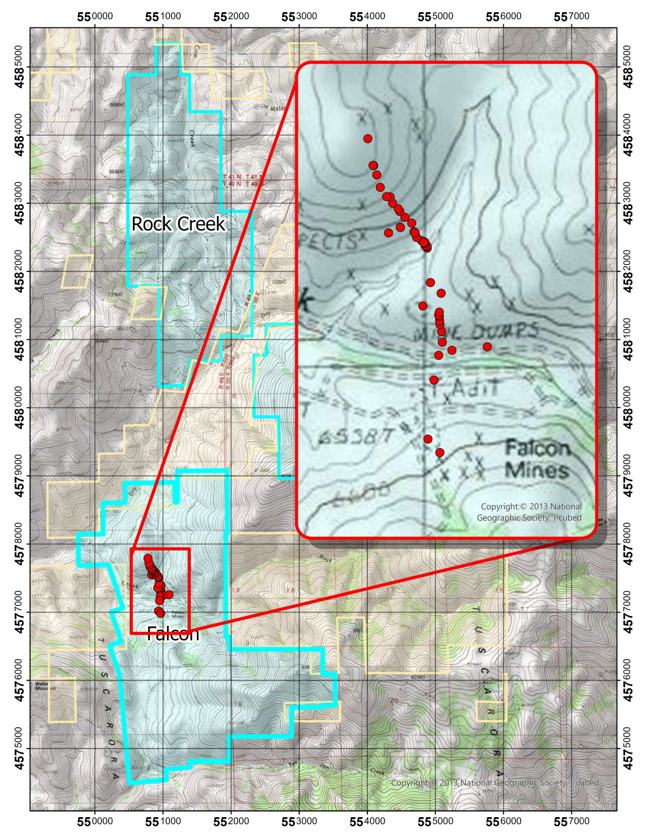 The sampling focused on the large vein hosting the historic Falcon Mine and Scorpion Mine. The Company was able to trace the vein at surface over a distance of approximately 1.5 kilometers from a prospect pit approximately 100 meters south of the Falcon mine entrance north towards Rock Creek. Forty samples were collected from vein outcroppings and float at intervals along the vein as well as along a road cut crossing this vein between the Falcon and Scorpion mine workings. The samples have been delivered to the lab for assay and analysis.