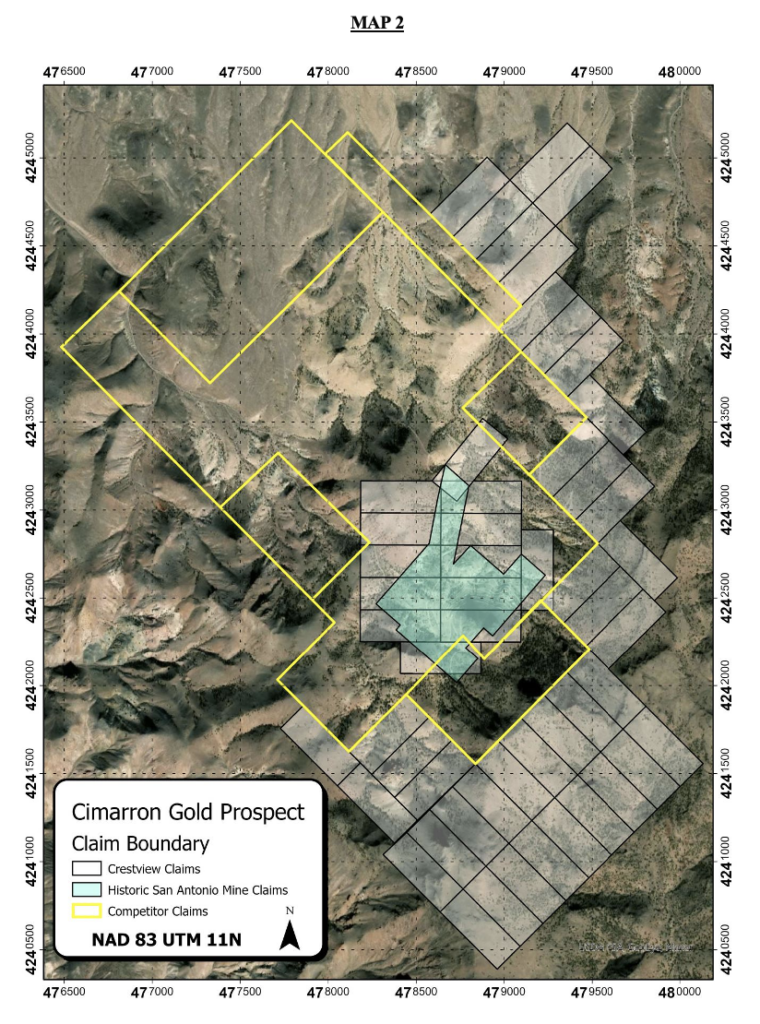 The Cimarron gold prospect is a high-grade epithermal gold target associated with the historic San Antonio mine. The prospect is located in Nye County, Nevada approximately 30 kilometers North of the mining town Tonopah, NV (see Map 1 below). The property was acquired with 13 unpatented lode claims which overlap and control the 6 historically-producing claims around the San Antonio mine. These six historical claims represent the core of the property. In addition to the San Antonio mine which was active in the early 1900’s, these core claims had approximately 190 holes and 54,000’ drilled in the 1980’s. With the additional 40 claims staked, Crestview now holds 53 claims at the Cimarron project. The new claims were staked on the nearest open ground to the North, East, and South of the core claims (see Map 2 below).