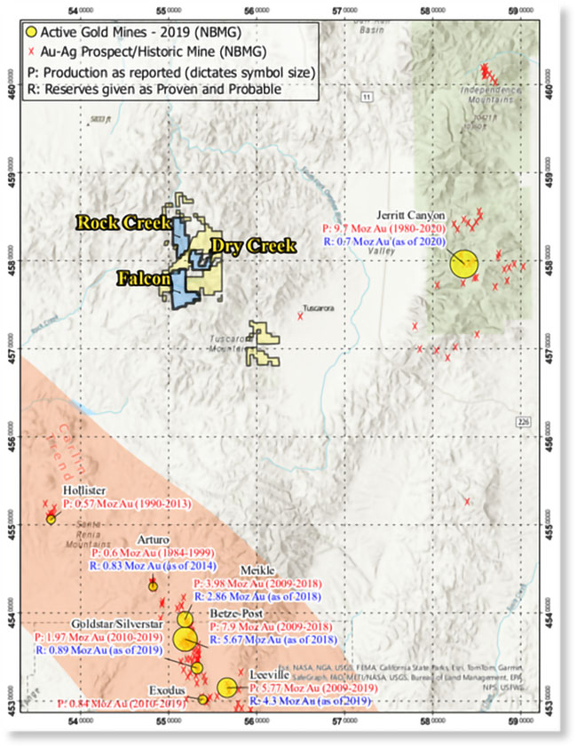Crestview’s Tuscarora district play (Rock Creek, Dry Creek, and Falcon) is in a highly prospective, prolific gold region (see Map 2). The properties are surrounded on three sides by giant, “world-class” gold deposits and mines, including the Midas mine, approximately 35 km to the west-southwest, which has produced more than 2.2 Moz Au and 26.9 Moz Ag with proven and probable reserves of an additional 2.73 Moz Au and 199.92 Moz Ag from an epithermal Ag (Au) deposit (Hecla Mining Company Website – 2022); the Goldstrike  complex, approximately 45  km south, which  produced an incredible 47.8 Moz Au by the end of 2023 from Carlin-type deposits (Nevada Bureau of Mines and Geology Special Report MI-2023)  ; and the Jerritt Canyon mine, approximately 30 km to the east (further from the Carlin Trend than the Tuscarora properties), which has produced 9.7 Moz Au from a Carlin-type gold deposit (Technical Report on the Jerritt Canyon Mine, Elko County, Nevada, USA Report for NI 43-101 – 2021), with continued exploration ongoing.