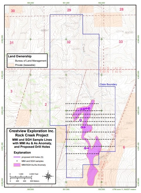 Calgary, Canada June 10, 2022 – Crestview Exploration Inc. (CSE: CRS, Frankfurt: CE7) (“Crestview” or the “Company”) is pleased to announce an upcoming Controlled-Source Audio-frequency Magnetotelluric (CSAMT) geophysical survey at the Rock Creek gold prospect to be conducted by Geophysics GPR International Inc. The survey will include four East-West lines from across the property (Figure 1), and is slated to begin mid-July, 2022.