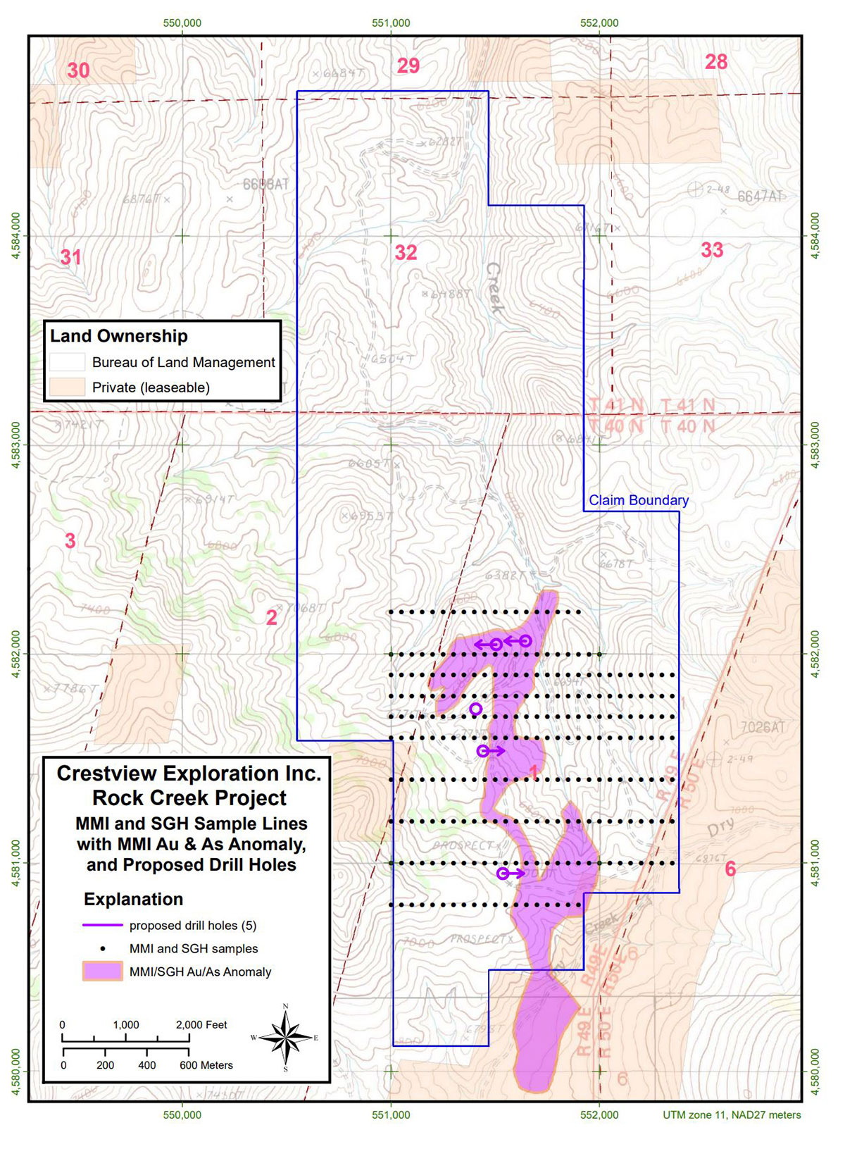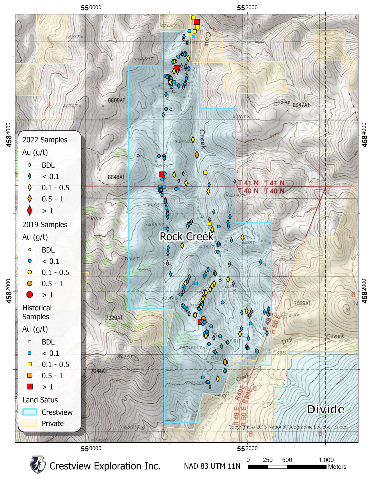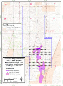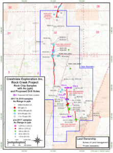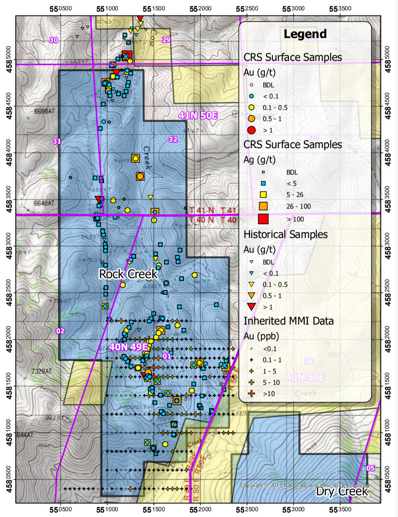 With over 200 samples collected to date, the surface sampling program at Rock Creek has demonstrated wide-spread anomalous gold and silver, including numerous samples with greater than 30 g/t Ag (including a sample of 121 g/t Ag), and samples with greater than 0.1 g/t Au (including four samples with greater than 0.5 g/t Au). Most of the sampling focused on epithermal quartz veins exposed in outcrop and historic prospect pits. The Rock Creek data also includes inherited gold assay results from historic sampling which included several samples greater than 1 g/t Au.