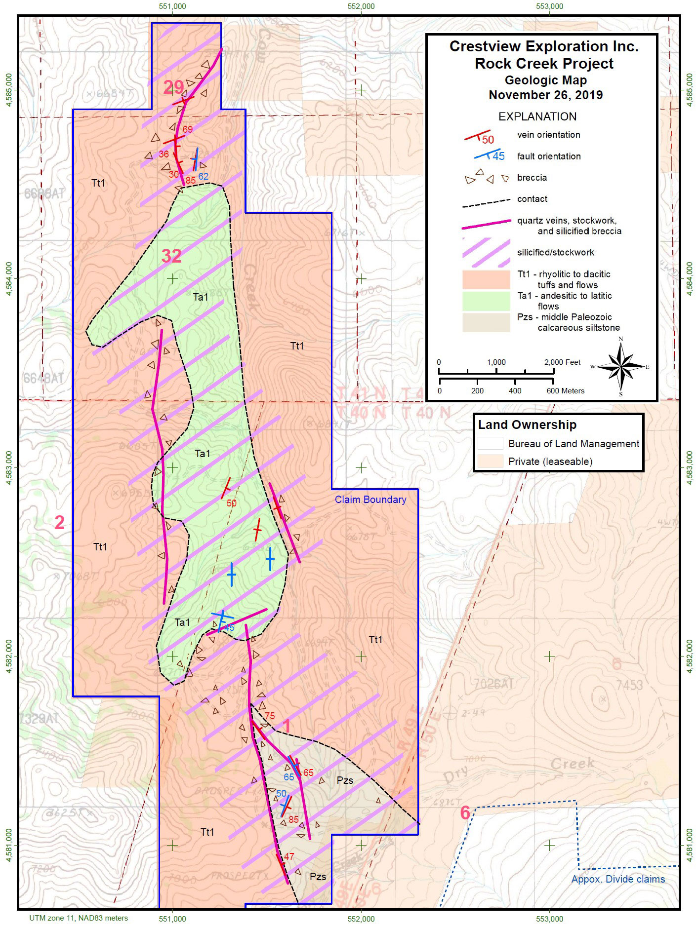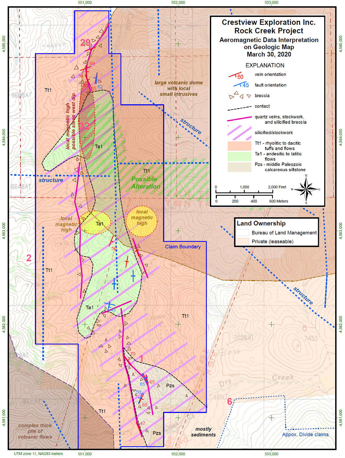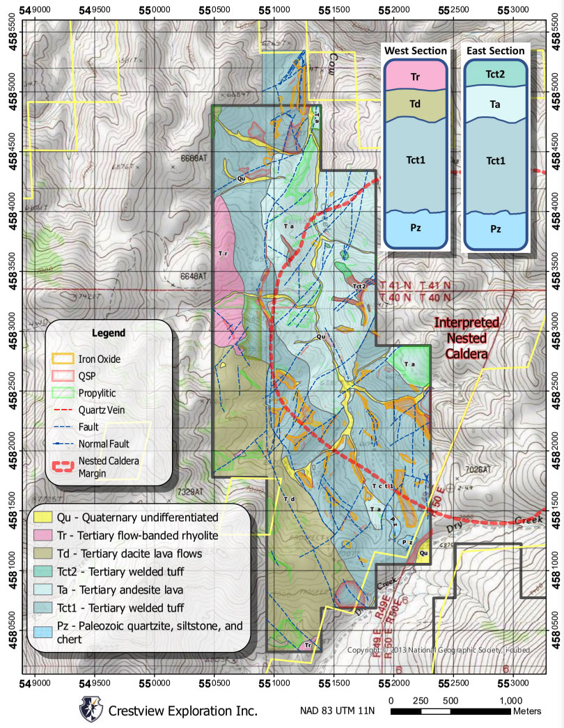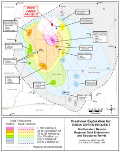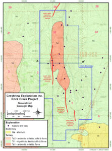 Upon completion of the geological mapping at Rock Creek, four conceptual targets are envisioned at the property, including 1) Veins and ore shoots in the volcanic package; 2) Deep-seated structures along the interpreted nested caldera; 3) Along the unconformity between the Tertiary volcanic rocks and the underlying Paleozoic meta-sedimentary rocks; and 4) Disseminated mineralization in the Paleozoic rocks at depth (Carlin-type).