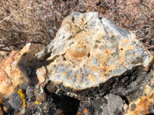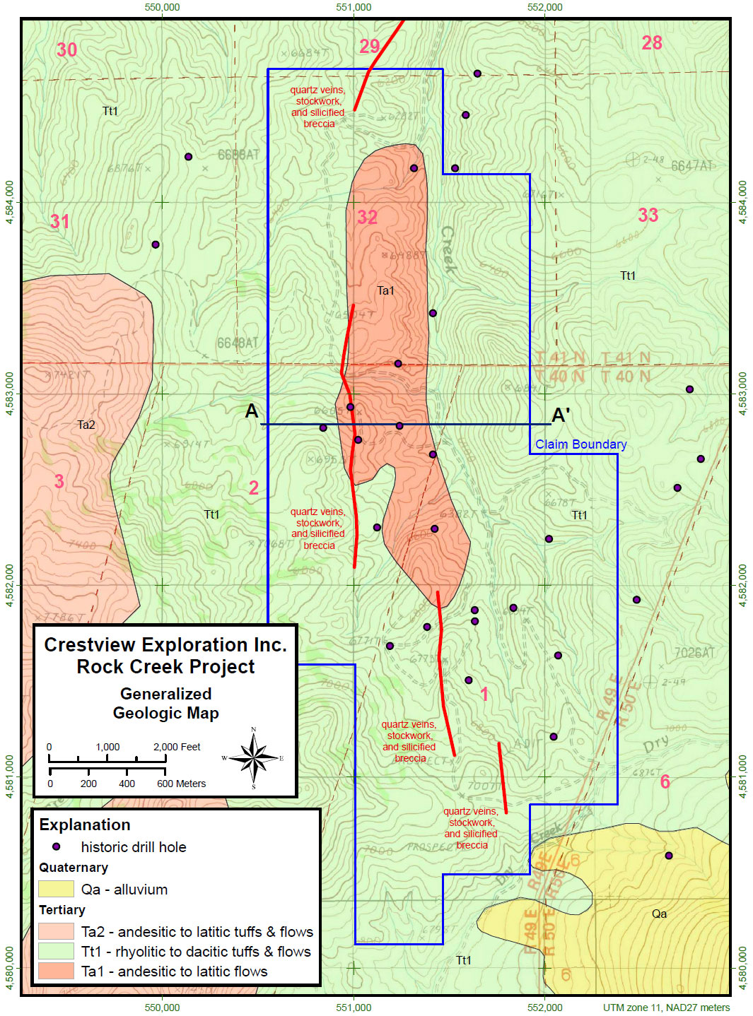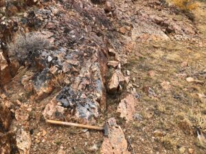 The faults and quartz veins delineate major structural trends of mineralization and alteration at Rock Creek. The quartz veins occur in several structural systems that dominate the entire Rock Creek property. Higher gold and silver grades correlate well with the presence of visible sulfides (arsenian pyrite) and jarosite in the quartz veins. Elevated arsenic and barium are ubiquitous in the samples, and there is a notable lack of mercury.