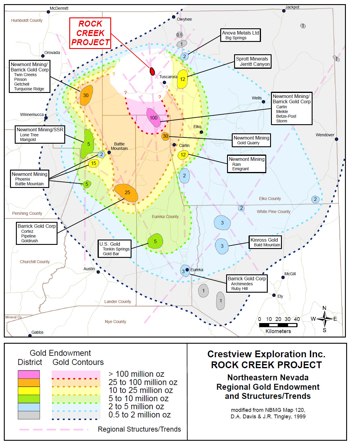 Rock Creek hosts two parallel north-south gold mineralized vein-breccia structures which run the length of the property. Historic drill data for the project shows the early drilling encountered gold mineralized Paleozoic silty carbonate rocks at depth and proximal to the structures. The Paleozoic sedimentary rocks share many of the characteristics of the favorable gold host rocks found on the Carlin Trend; specifically, those at the Meikle mine located approximately 20 miles (32 km) to the south. These deep reaching structures acted as a plumbing system to allow gold mineralizing fluids into the favorable host rocks as found by the shallow early drilling on the project. None of these early holes tested the favorable rocks below a depth of 500 ft. (152 meters) as most of the holes were terminated much sooner. Where these Paleozoic rocks are proximal to the structures represent excellent drill targets.