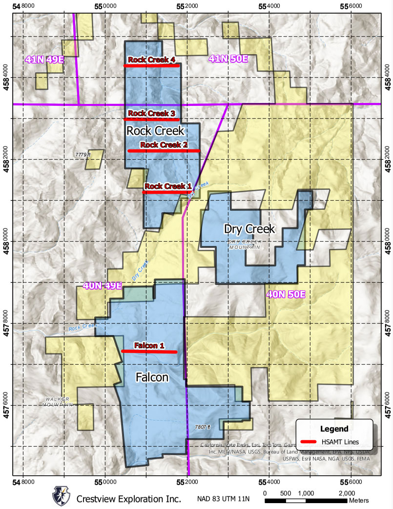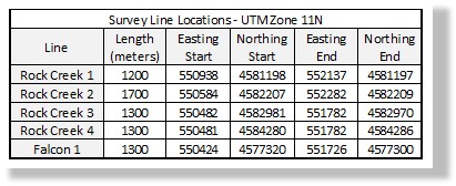 Four Hybrid-Source Audio Magnetotellurics (HSAMT) geophysical survey lines were carried out at Rock Creek, and one line was conducted at Falcon.