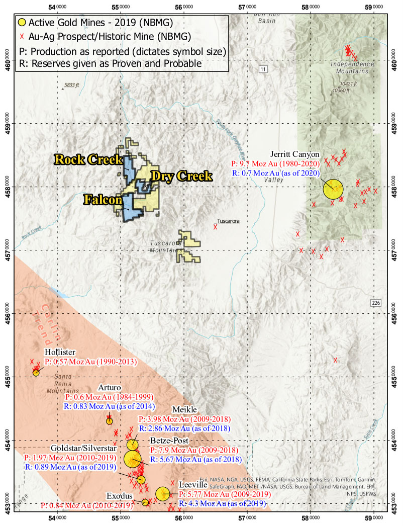 The Rock Creek, Falcon, Divide, and Castile Mountain properties are all in the Tuscarora Mountains, located NE of the prolific Carlin Trend in Elko County, NV. The properties are in close proximity to major gold deposits on 3 sides, with Midas approximately 35 km to the WSW, Goldstrike approximately 45 km to the S, and Jerritt Canyon approximately 30 km to the East.